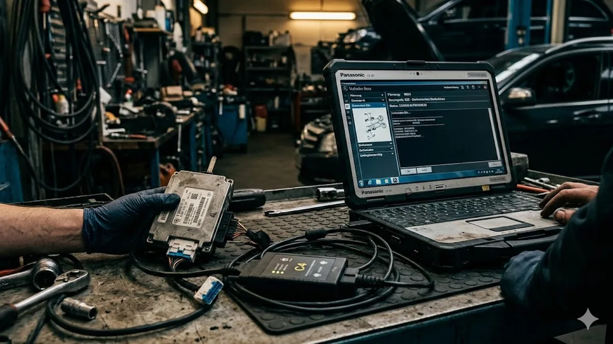 Gebrauchtes ME/MED-Motorsteuergerät im Mercedes einbauen: Warum Umstecken nicht funktioniert, was Entheiraten und Renew per XENTRY bedeuten.